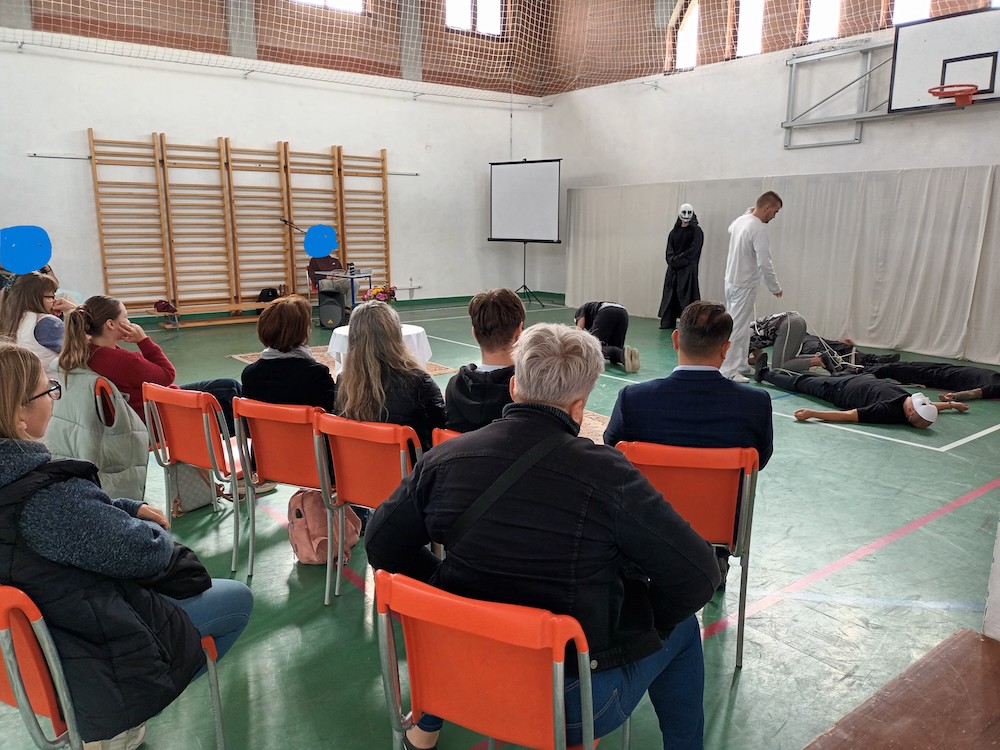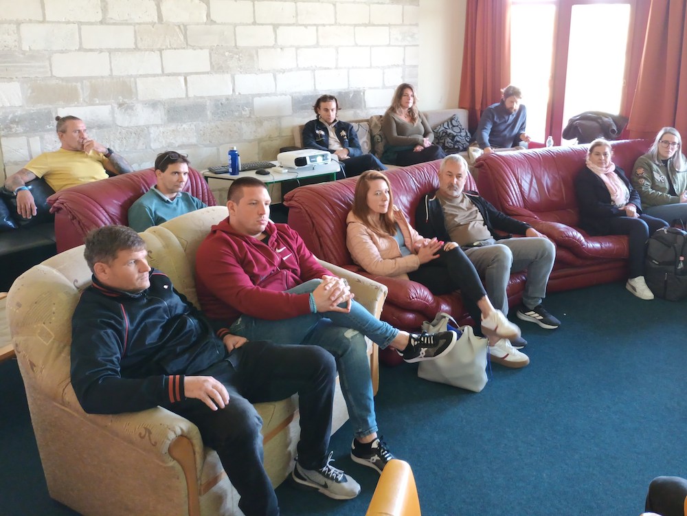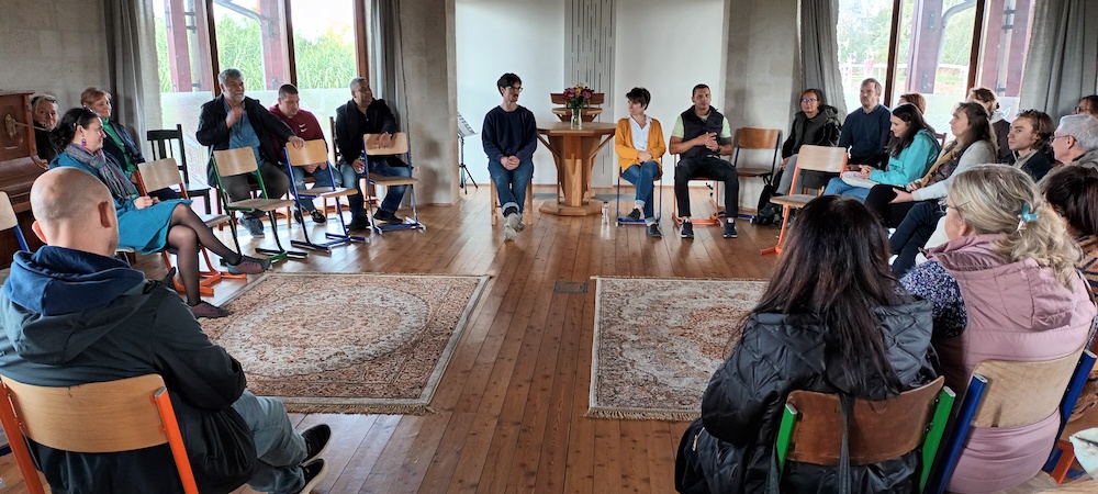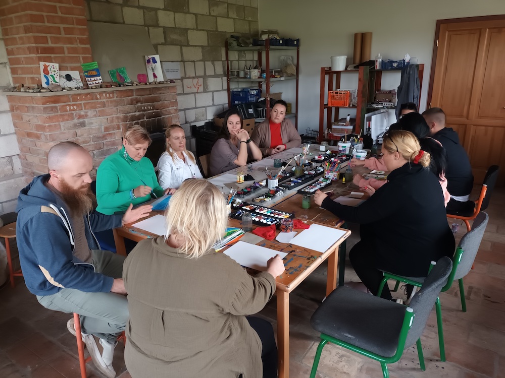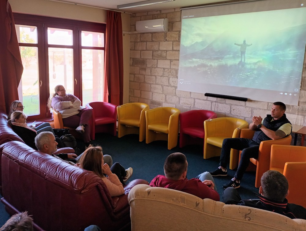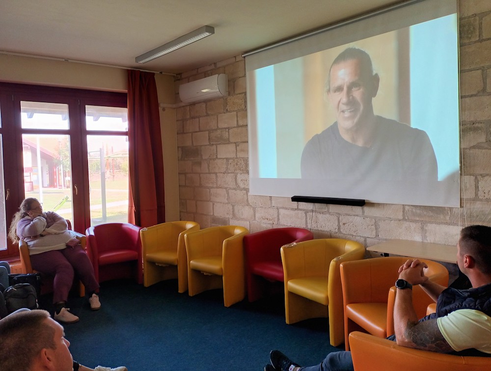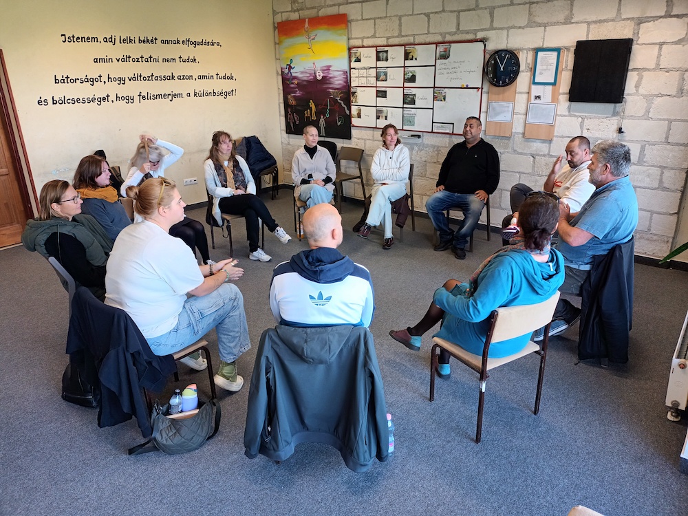 Szeptember 30-án vendégeinknek csoportfoglalkozás-bemutatót tartottunk, megismerhették, hogyan zajlik a terápia egyik alapeleme, a reggeli találkozó. Majd öt különféle műhely közül választhattak a résztvevők. Burai Csaba és Centgraf Károly terápiás munkatársak élmény alapú bizalomépítő csoporttal készültek, Kiss Tímea és Vajóczki Mária mentorok a kreatív műhelyben folyó munkát, Bakos Bence pszichológus az autogén tréninget mutatta be az érdeklődőknek. Németh Mihály stábkoordinátor, Szülek István, Csernus Zoltán és Hegedüs Dániel tapasztalati segítők a sportnak a felépülésben betöltött szerepéről beszéltek. A tornateremben pedig a terápiás közösség tagjaival készített drámapedagógiai előadással, életútmegosztással várta a szakembereket Fakó István munkatársunk.
